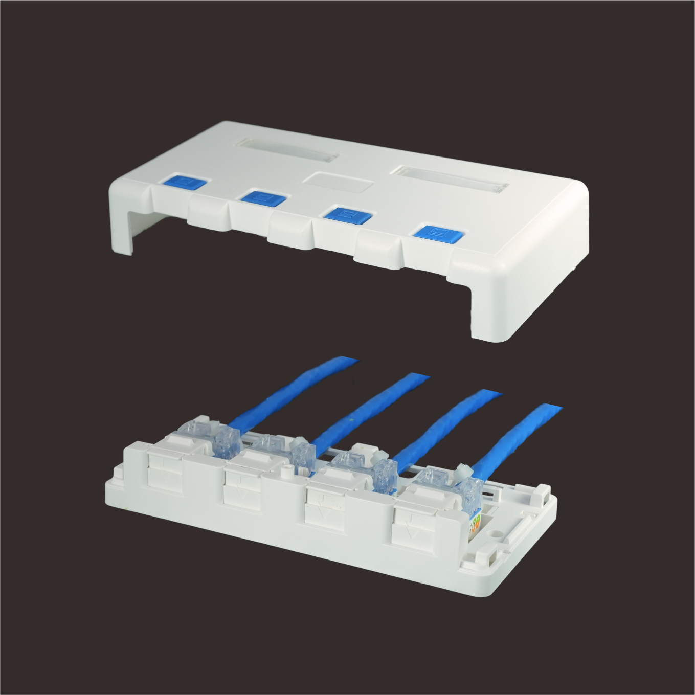 3004ADIThe 3004ADI is a four-port Surface Mount Box equipped with spring-loaded shutter. The box features removable v-cut knockouts on the sides and rear for flexible cable routing using pliers or cutters. Each port includes color-coded icons - blue for data and green for voice - to clearly identify ports’ application. The top-mounted ID label and cover provide easy workstation identification.