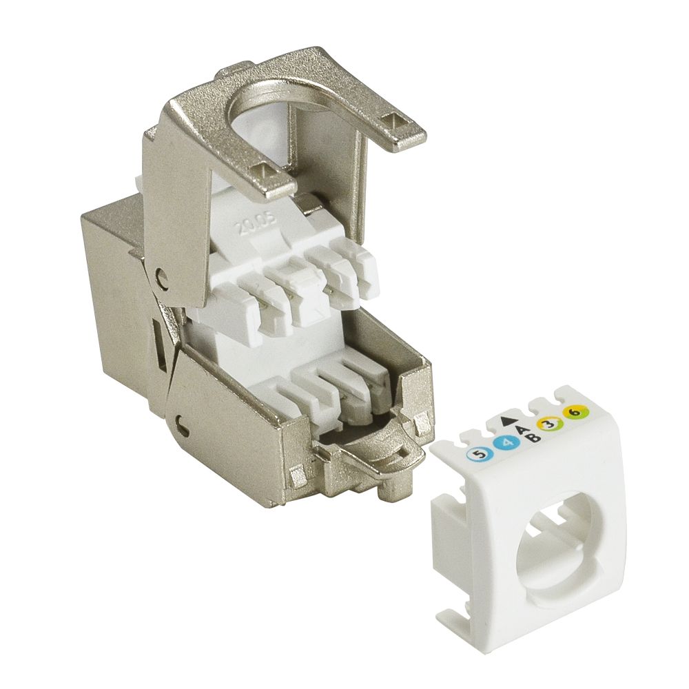 STP keystone jack (LFQJBS3 Series) comes with T568A/T568B color label and fully complies with connecting hardware transmission performance of ANSI-TIA-568.2-D for Return loss, Insertion loss, NEXT loss, FEXT loss, TCL, TCTL, PSANEXT loss, and PSAFEXT loss up to 500MHz.