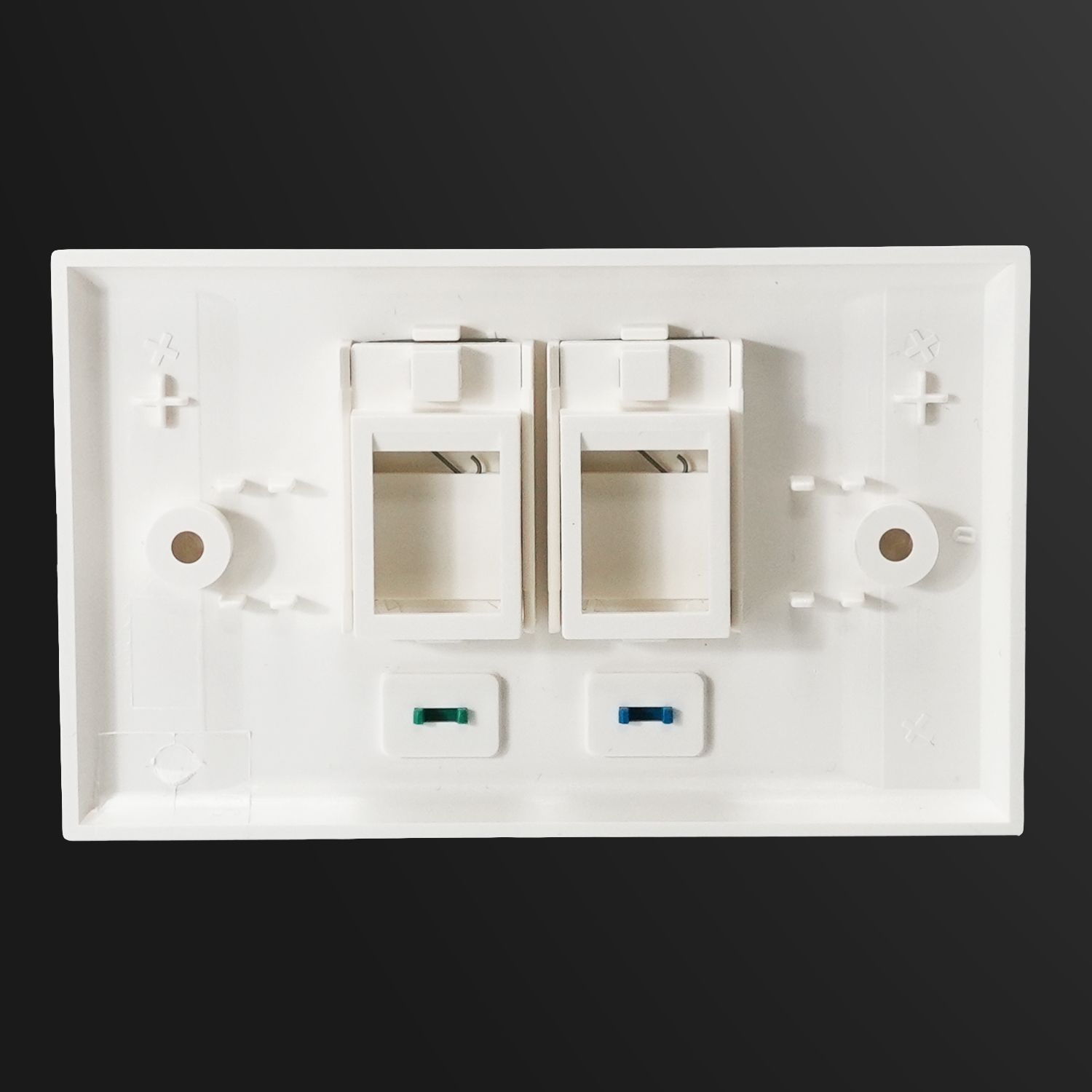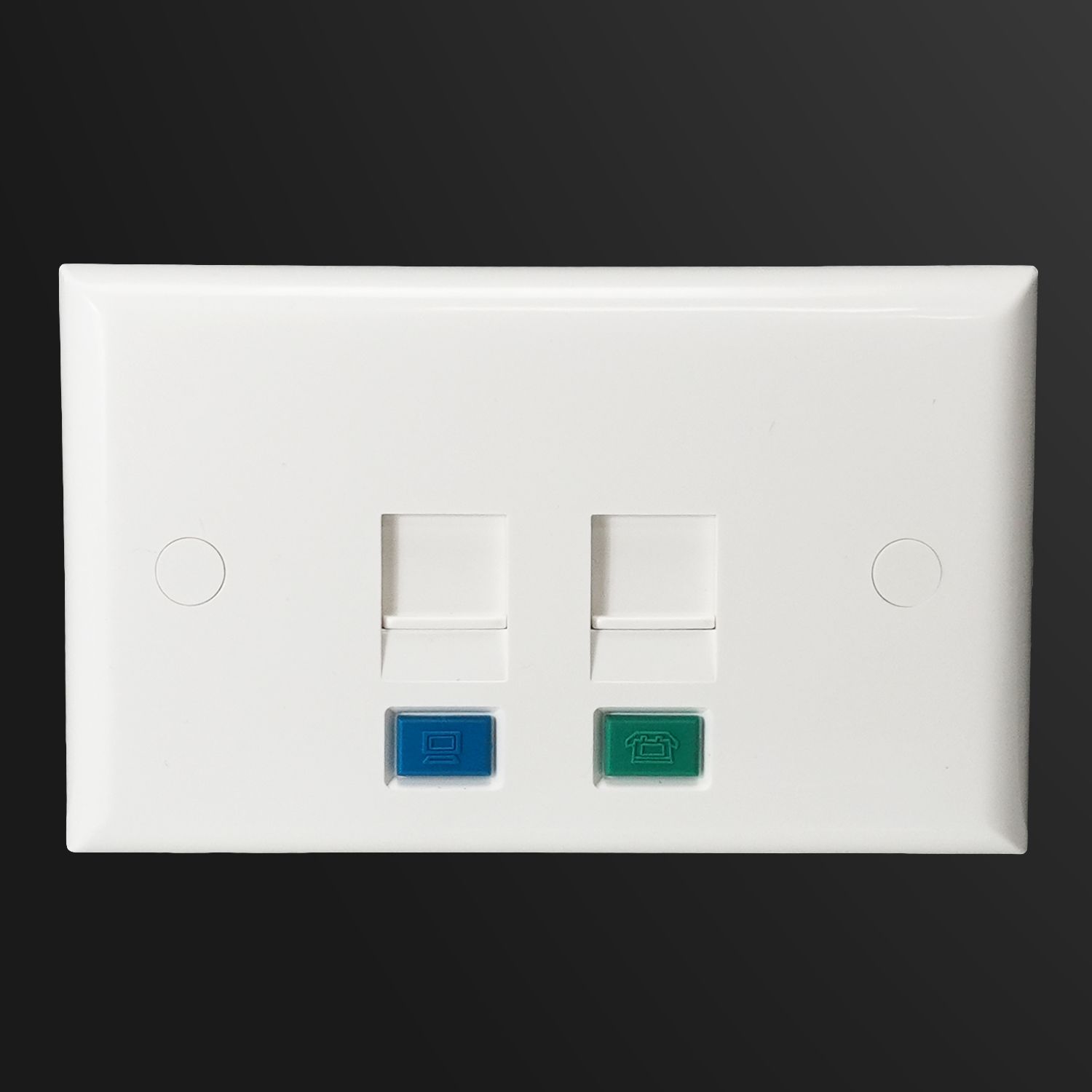 An icon slot above each port allows for easy port labeling using the included icons—blue for data, green for voice. Sized at 70.15 x 113.8mm, the faceplate includes screw caps to cover mounting screws for a clean, finished look.