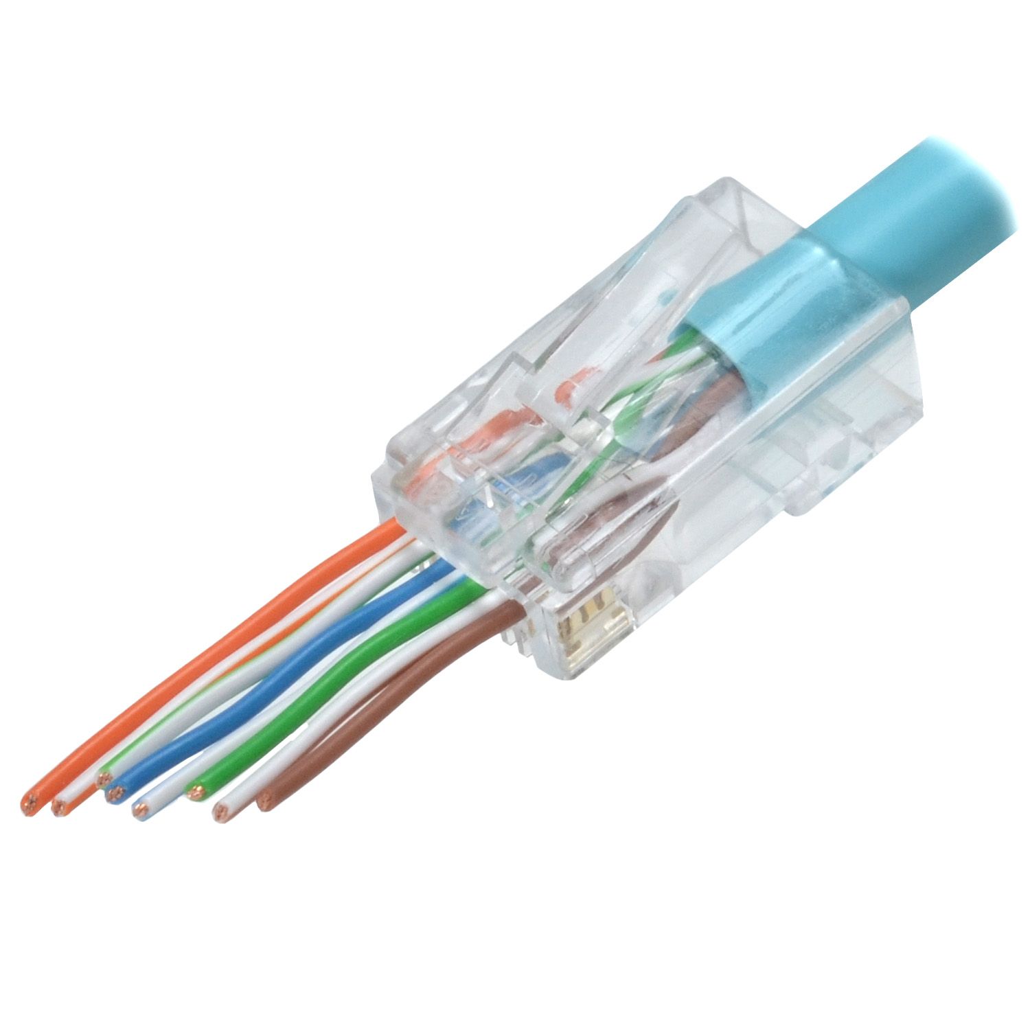 The Pass-Through plug gives you the convenience of threading the wires through the end wall and cutting them afterward. Only a very short untwisted length is presented while the cable is fully inserted into the taper, which is the secret to Cat 6A compliance.