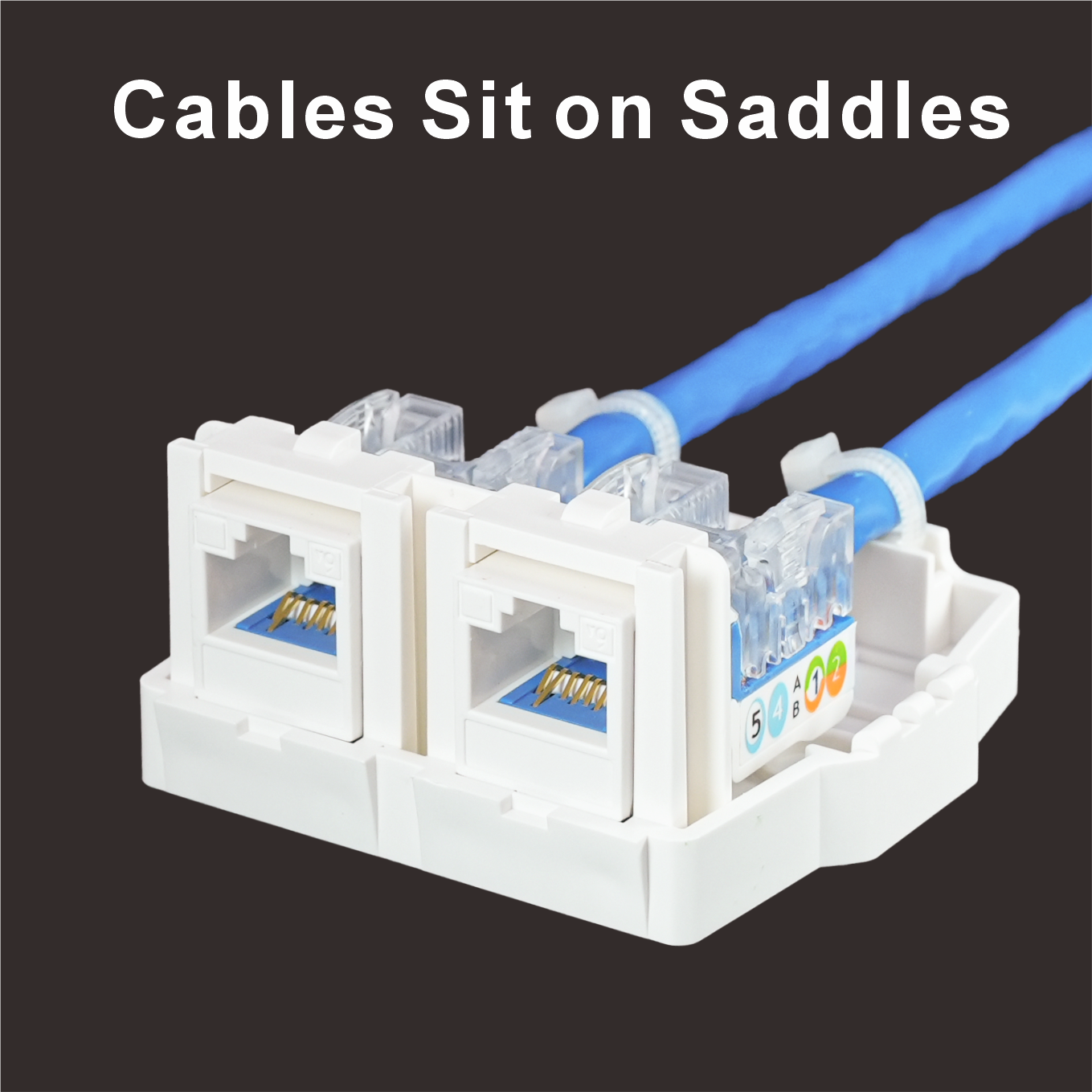 Though compact in size, the interior comfortably fits two full-size keystone jacks (up to 20.8mm W × 24.1mm H × 46.5mm L each). Cable saddles and tie slots inside provide excellent strain relief. The cover and ID label lid open easily by hand - no tools needed.
