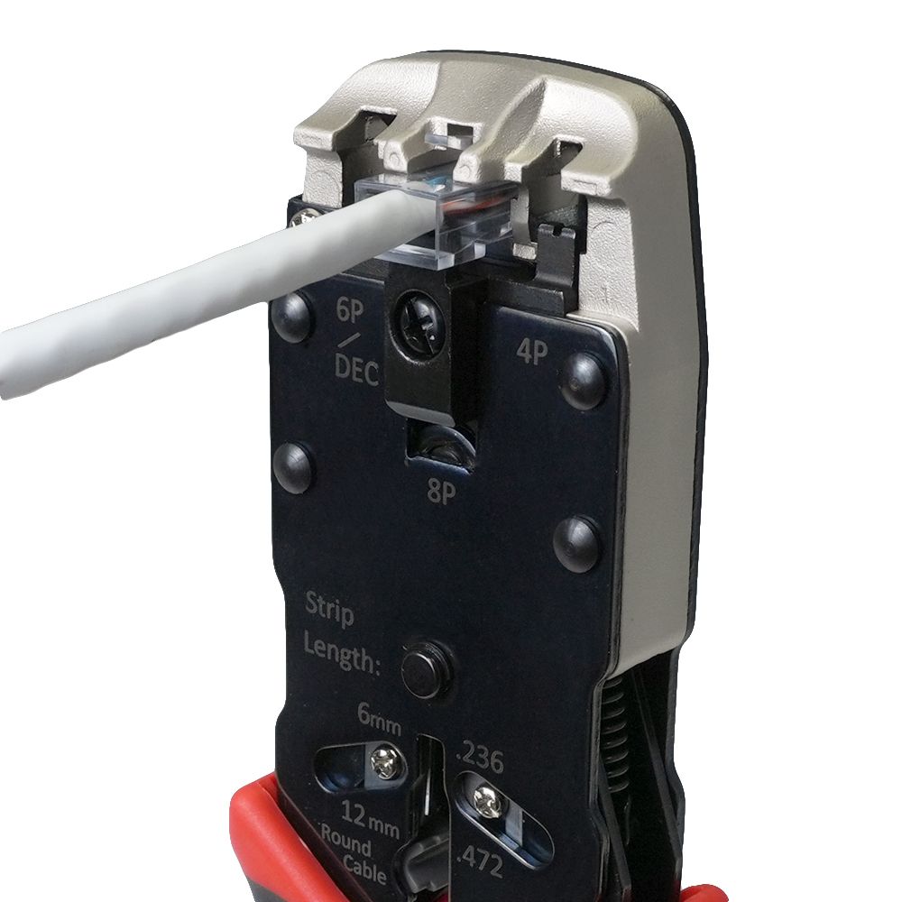 007A8H03Crimp 4P/6P/8P/DEC modular plugs using our All-in-One Modular Plug Crimper designed for precision crimp. Easily switch between voice/data plugs and prepare your cable with a single tool. Comes with integrated cable stripper and cutter for cable preparation, compatible with a wide range of cable outer diameter (O.D.) from Ø5.0 to Ø8.0.