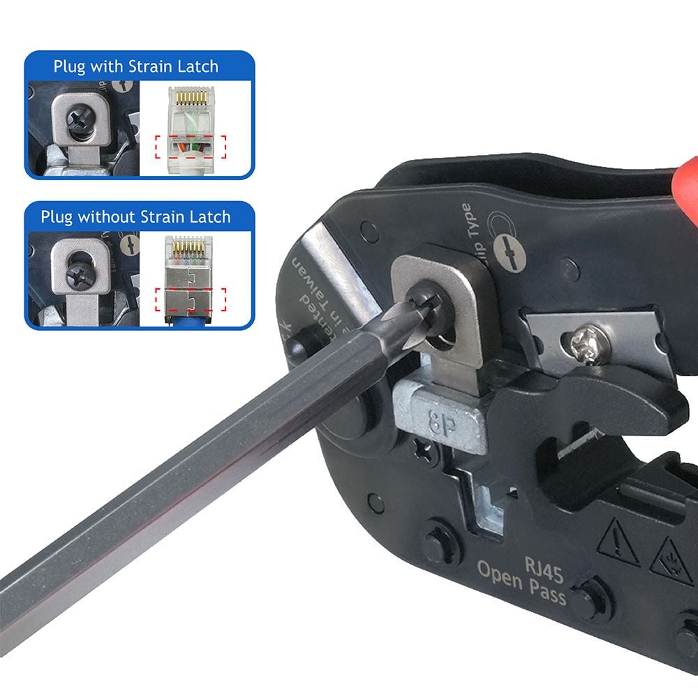 007A8H07Crimp and trim 8P(RJ45) pass-through/non pass-through modular plugs, crimp strain latch (or not), and wrap ground collars onto cable with a single tool. Comes with integrated cable stripper and cutter for cable preparation, compatible with a wide range of cable outer diameter (O.D.).
