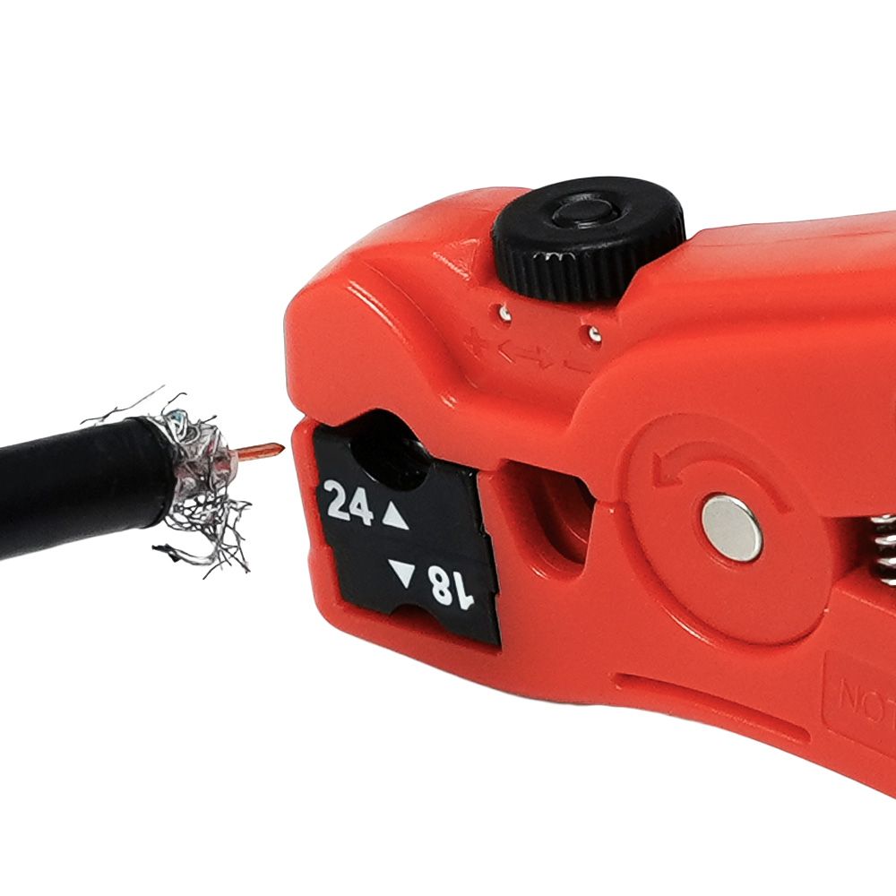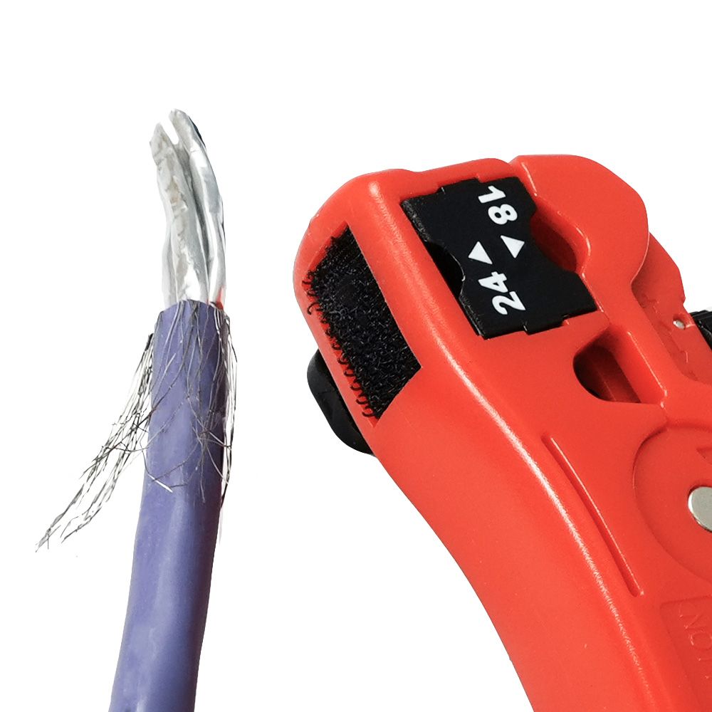 3013ACSH03AStrips and cut coax (video), twisted pair (data), telephone round and flat (voice) and other multi-conductor cables in 18 & 24 AWG. The Versatile Adjustable Stripper with Cutter handles a range of Cable O.D. from ∅3.2 to ∅8mm with an adjustable cutting depth for accuracy. It also comes with a black velcro strip attached at the bottom to brushes the braid screen back over the cable jacket.
